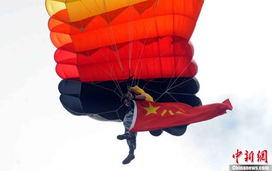 为庆祝香港回归祖国15周年,解放军八一跳伞队7月1日在香港大球场表演花式跳伞,与市民一同庆祝及分享回归节日的喜悦。中新社发 谭达明 摄