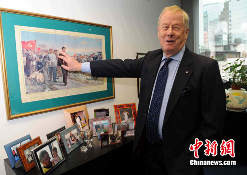 其他的摆设则像是他军旅生涯和中国情结的结合。书架上放着退役时同僚赠送的坦克模型。一幅描绘海湾战争的画里,他正坐在坦克中,指挥英国陆军精锐第4装甲旅“沙漠之鼠”。墙上却有一幅他从内地淘来的“古董”,画上毛泽东和意气风发的中国军人让他觉得有意思。另一边靠窗的位置摆着厦门荣誉市民的证书,按照他自己的形容,是十几年来他印象最深的记忆。