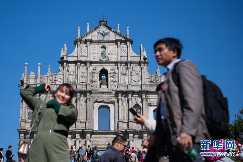 旅客在澳门大三巴牌坊前游览(12月12日摄)。新华社记者 张金加 摄