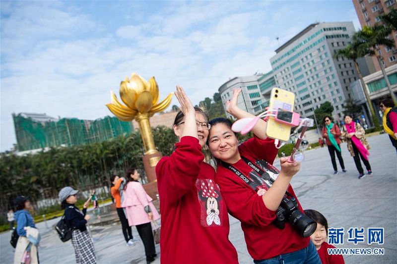 12月13日,旅客在澳门金莲花广场游览。新华社记者 张金加 摄