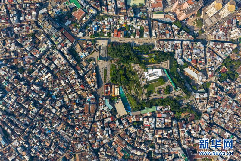 澳门大三巴牌坊和大炮台一带景色(10月21日无人机拍摄)。新华社记者 张金加 摄