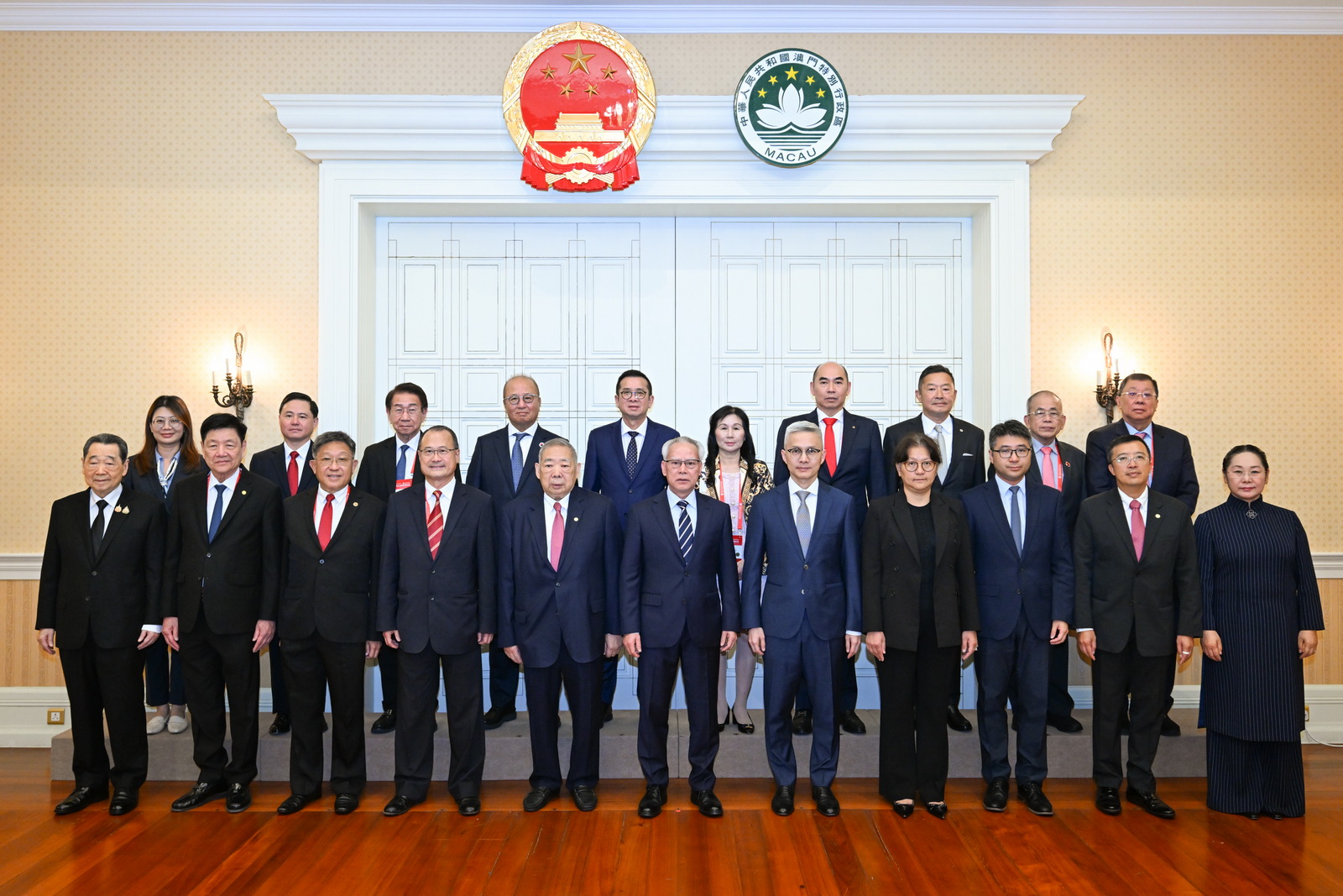 行政長官岑浩輝今日下午在政府總部與澳門中華總商會會長崔世昌及世界華商大會顧問委員會成員會面,就澳門與橫琴粵澳深度合作區的制度優勢、投資與營商環境等議題交流意見。