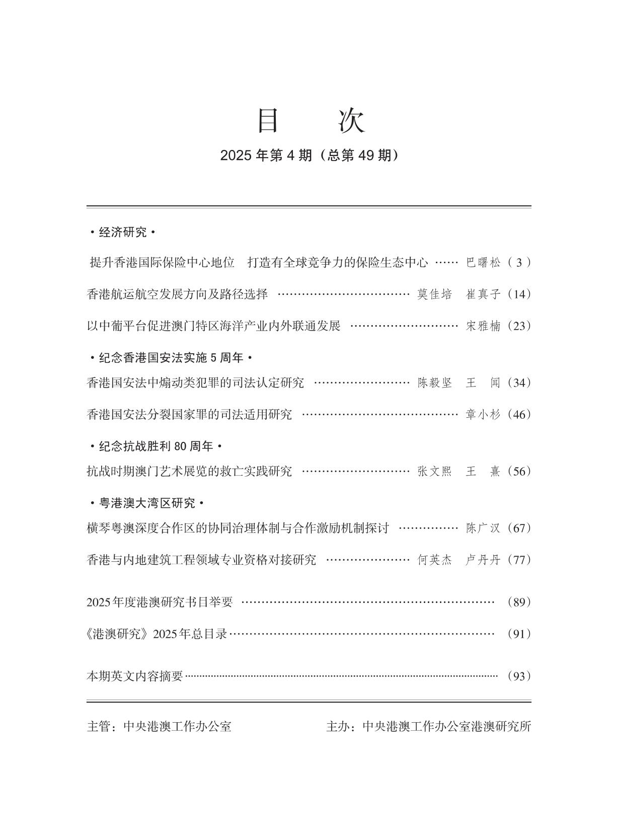 《港澳研究》由中共中央港澳工作办公室主管、中央港澳工作办公室港澳研究所主办,是我国港澳研究领域唯一面向海内外公开发行的综合性学术期刊。期刊围绕学习贯彻习近平总书记关于港澳工作的重要论述、港澳回归周年庆等组织专栏文章,并常设“一国两制”理论研究、政法论坛、经济研究、社会研究、历史文化研究、粤港澳大湾区研究等栏目。《港澳研究》编辑部热诚欢迎海内外学者朋友惠赐佳稿,我们将进一步提升刊物服务质量,共同推进港澳研究繁荣发展。