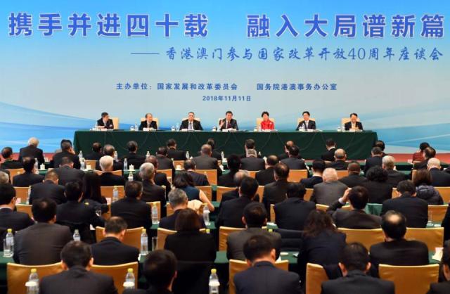 11月11日,由国家发展改革委、国务院港澳办共同主办的“携手并进四十载 融入大局谱新篇——香港澳门参与国家改革开放40周年座谈会”在京举行。全国政协副主席、国家发展改革委主任何立峰出席座谈会并作主旨演讲,与港澳各界人士共话国家改革开放40周年的伟大成就和香港、澳门参与改革开放的不平凡历史,共商深化内地同香港、澳门互利合作,支持港澳融入国家发展大局的重要举措。香港特别行政区行政长官林郑月娥、澳门特别行政区行政长官崔世安分别率香港、澳门各界庆祝国家改革开放40周年访问团出席座谈会并致辞。国家发展改革委副主任宁吉喆主持座谈会并作总结致辞。国务院港澳办、香港中联办、澳门中联办和国家发展改革委负责同志出席座谈会。