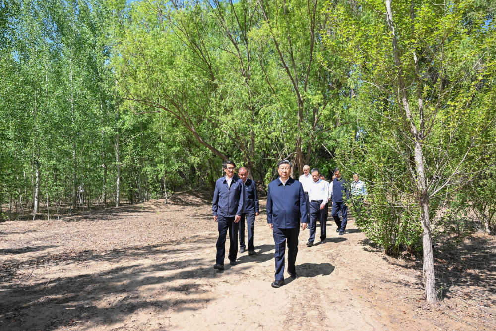 6月5日至6日,中共中央总书记、国家主席、中央军委主席习近平在内蒙古巴彦淖尔考察,并主持召开加强荒漠化综合防治和推进“三北”等重点生态工程建设座谈会。这是6日上午,习近平在临河区国营新华林场考察。新华社记者 谢环驰 摄