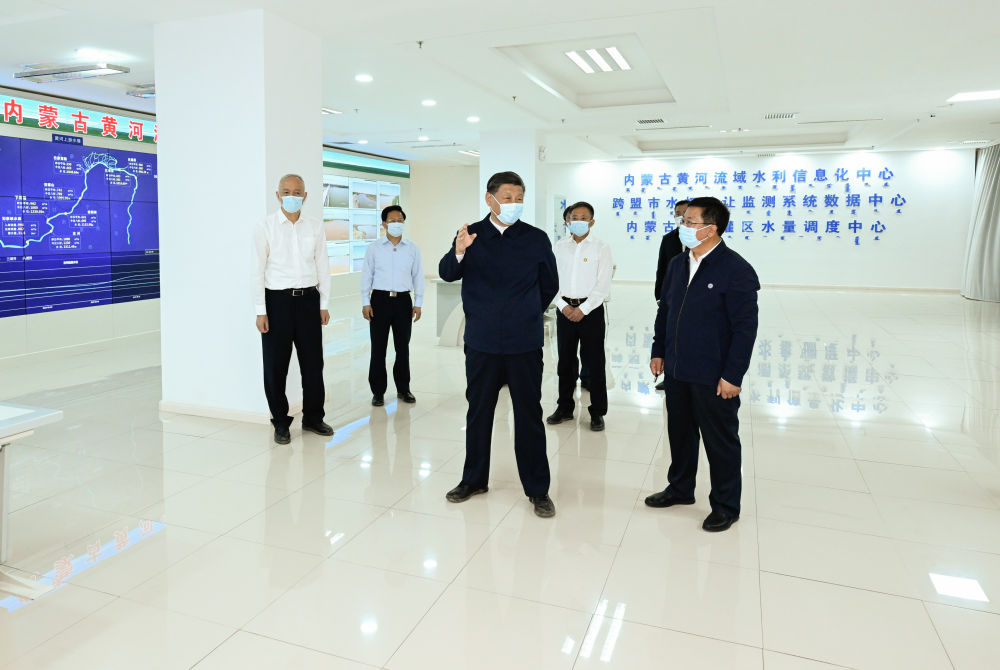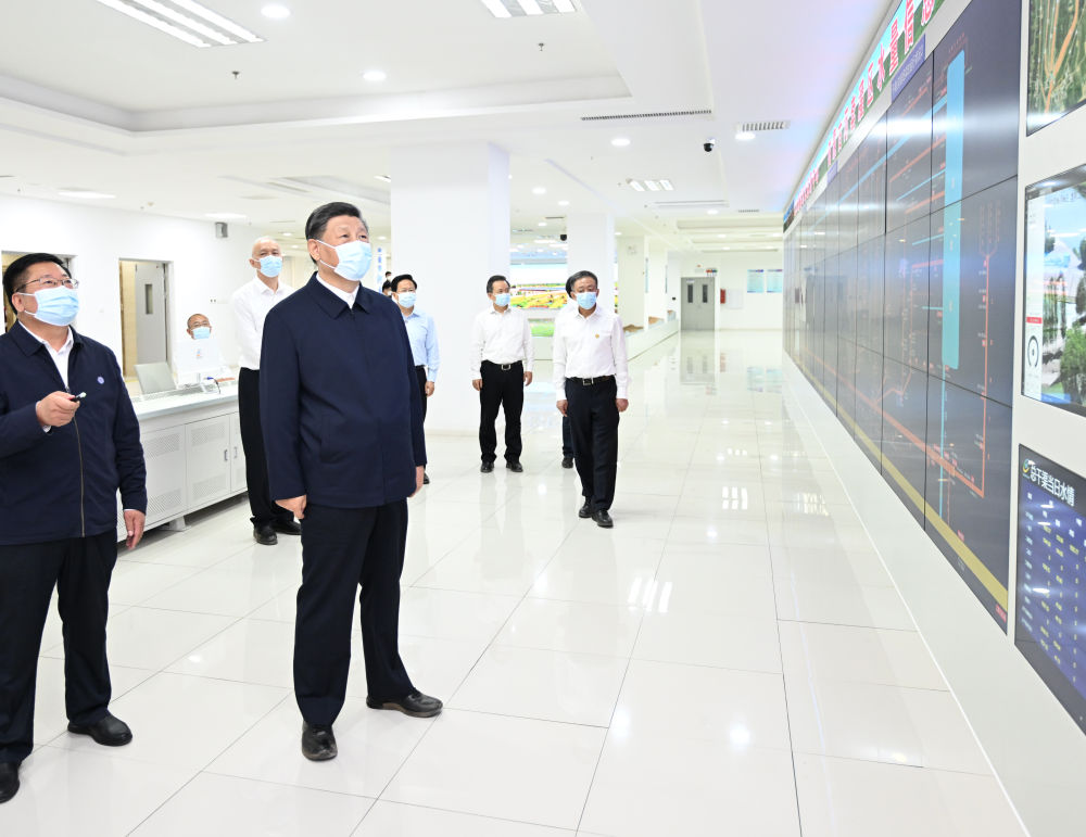 6月5日至6日,中共中央总书记、国家主席、中央军委主席习近平在内蒙古巴彦淖尔考察,并主持召开加强荒漠化综合防治和推进“三北”等重点生态工程建设座谈会。这是6日上午,习近平在河套灌区水量信息化监测中心考察。新华社记者 申宏 摄