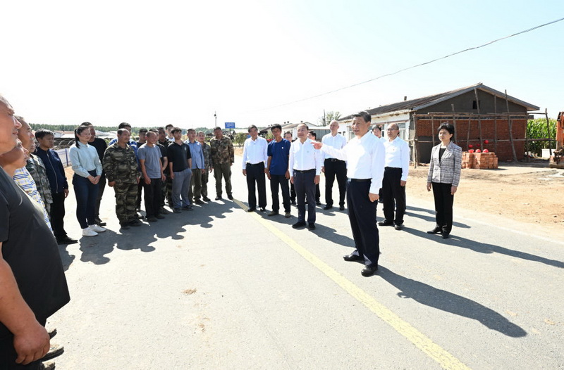 9月6日至8日,中共中央总书记、国家主席、中央军委主席习近平在黑龙江考察。这是7日上午,习近平在遭受洪涝灾害的哈尔滨尚志市老街基乡龙王庙村,同当地村民和施工人员亲切交流。新华社记者 谢环驰 摄