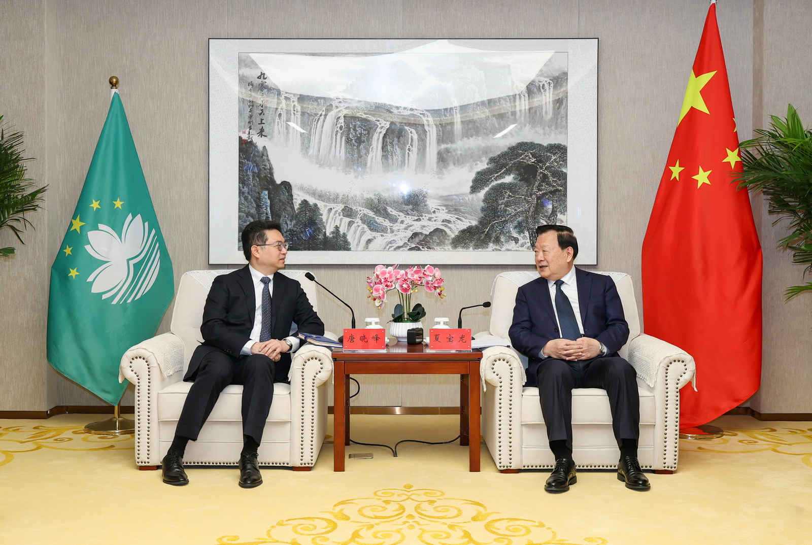 3月31日上午,中央港澳工作办公室主任、国务院港澳事务办公室主任夏宝龙在北京会见澳门特区检察院检察长唐晓峰一行。